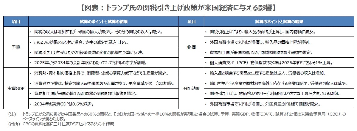 このように、トランプ氏の関税引き上げ策は、米国経済にとって良い面と悪い面を持ち合わせていると考えられますが、米議会予算局(CBO)は2024年12月18日、トランプ氏が公約に掲げた中国製品への60%の関税と、そのほかの国・地域への一律10%の関税が実現した場合の試算を公表しました。具体的には、予算と経済(実質GDPと物価)への影響および分配効果についての見解が示されました(図表)。