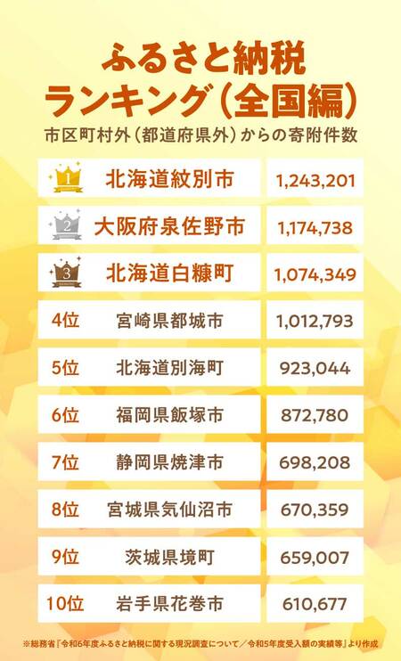 日本の地方自治体を支援するための寄付制度である「ふるさと納税」。自分の出身地や応援したい地域を自由に選んで寄付できたり、寄付金のうち自己負担額の2,000円を除いた金額が所得税や住民税から控除されたりとさまざまなメリットがありますが、やっぱり楽しみなのは返礼品。寄付先の自治体から地域の特産品や名産品の数々をゲットできて、しかも地域貢献までできると一石二鳥。そんなふるさと納税、人気の寄付先をランキング形式でチェックしていきます。