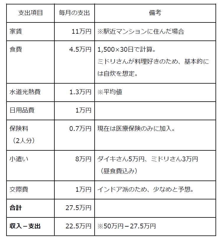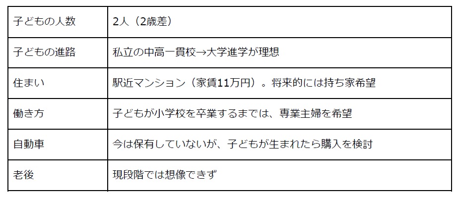 通常、FPがライフプランを立てる場合には、まず現在の収入と金融資産を確認します。しかし、2人はゼロから新しい生活を築いていきたいとの意向があったため、独身時代に築いた金融資産は考慮せずにプランを立てることにしました。ミドリさんが中心となって作成した2人の「理想のライフプラン」は下記のとおりです。