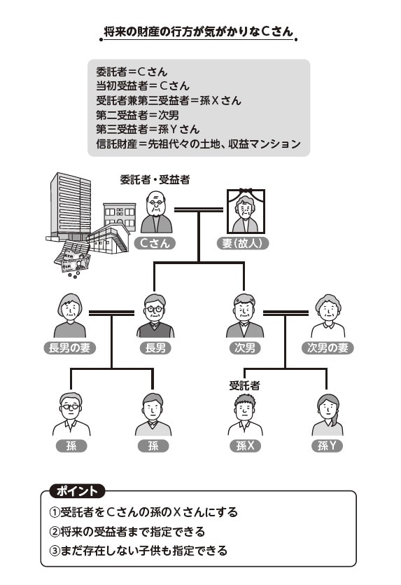 このように、連続して受益者を指定することができ、「次男の子供たちに先祖代々の土地を引き継いでほしい」というCさんの希望を叶えることができます。