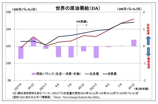 一方、中国需要の低迷が原油価格の大きな抑制要因となった。これまで世界の原油需要を牽引してきた中国の需要の伸びが失速し、先行きの低迷継続観測も高まった。非OPECプラスの生産増加も相まって、市場では2025年の供給過剰が強く意識され、原油価格の抑制に繋がった。