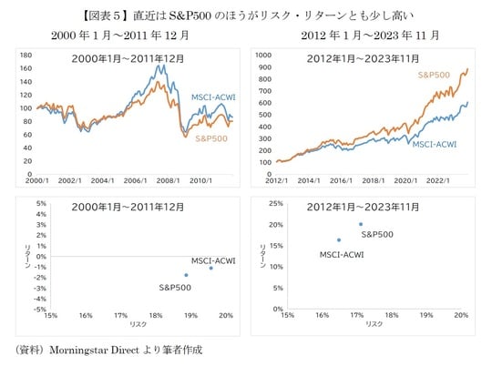 次に「オルカンかS&P500か論争」について考えてみよう。両指数とも長期的に上昇したが、図表2のとおり主に上昇したのは検証した24年間の後半だ。そこで検証期間を前半と後半の12年間ずつに分けて、リスクとリターンを比較したのが図表5だ。
