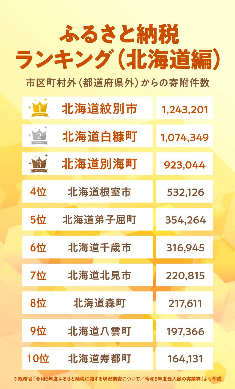 日本の地方自治体を支援するための寄付制度である「ふるさと納税」。楽しみなのはやっぱり返礼品。寄付先の自治体から地域の特産品や名産品の数々をゲットできて、しかも地域貢献までできると一石二鳥。今回は総務省がまとめた「2023年度の寄付件数」に基づいて「北海道」のふるさと納税ランキングを発表。寄付件数の多い順にベスト10を発表します。