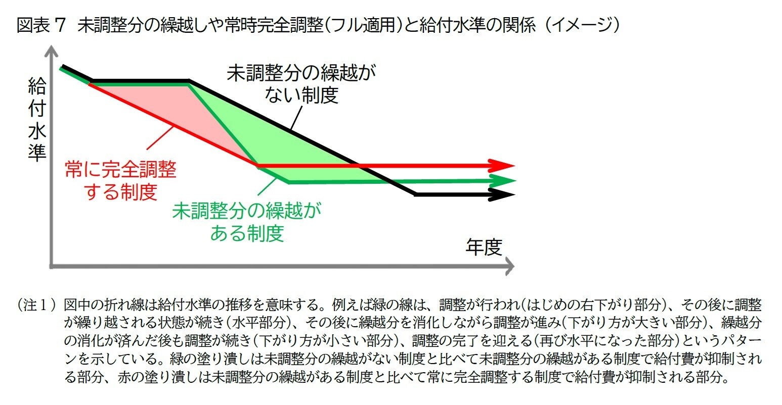 2016年の改正によって繰越しが導入され、それ以前と比べて年金財政の健全化が進みやすくなった。しかし、常に完全に調整する仕組み(いわゆるフル適用)に比べると、特例時に調整(その年度の給付水準の引下げ)が不十分となり、その分だけ年金財政の健全化が遅れて将来の給付水準が低下する([図表7])。