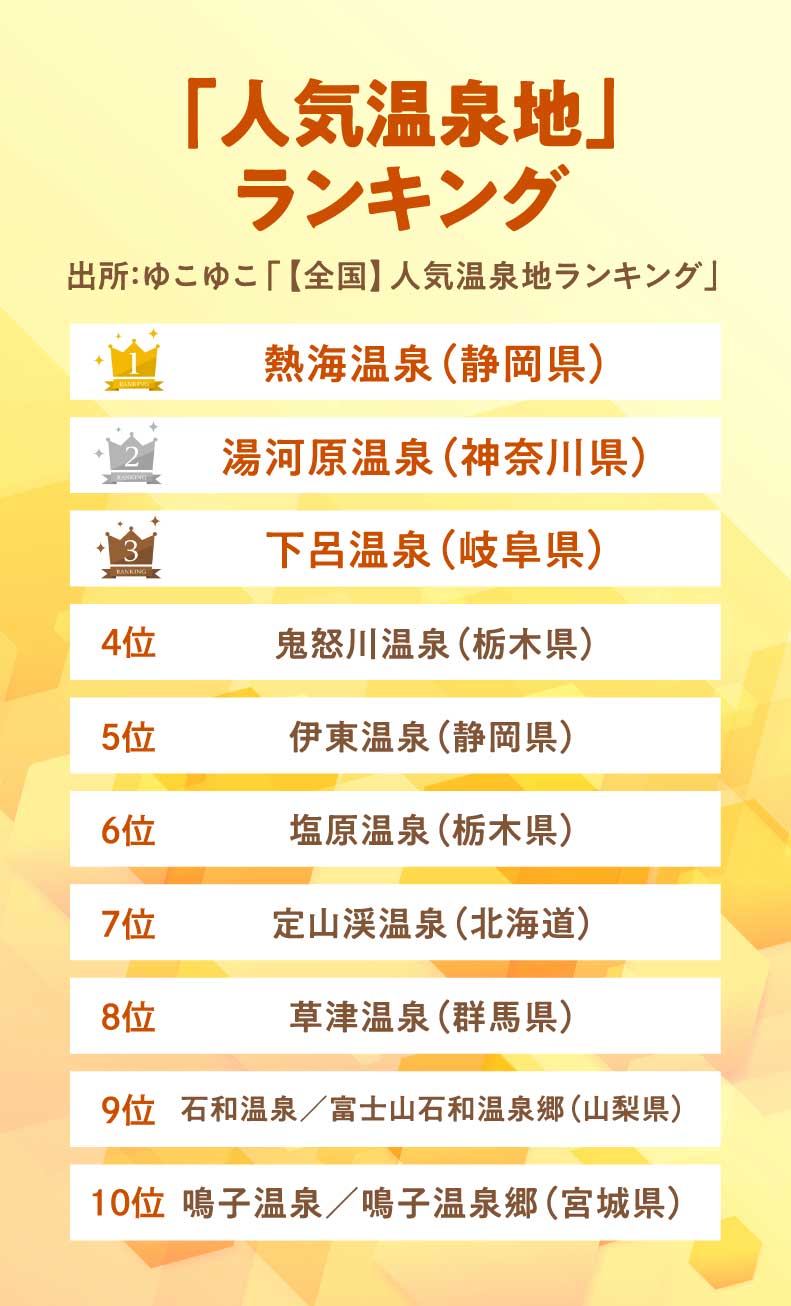 以上、TOP3を見てきました。第4位以降にランクインした温泉地は、以下のとおりです。