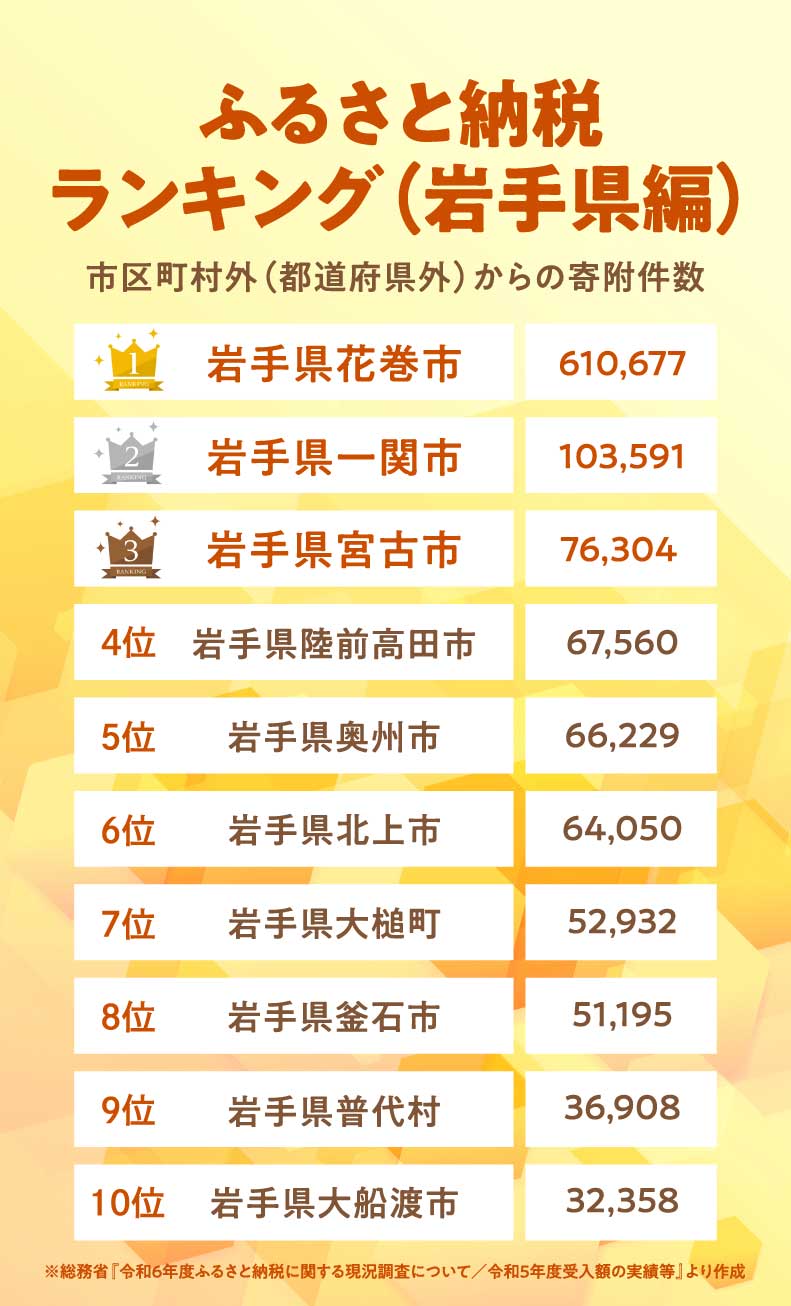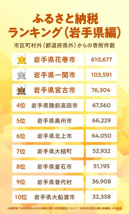 日本の地方自治体を支援するための寄付制度である「ふるさと納税」。楽しみなのはやっぱり返礼品。寄付先の自治体から地域の特産品や名産品の数々をゲットできて、しかも地域貢献までできると一石二鳥。今回は総務省がまとめた「2023年度の市区町村外からの寄付件数」に基づいて「岩手県」のふるさと納税ランキングを発表。寄付件数の多い順にベスト10を発表します。
