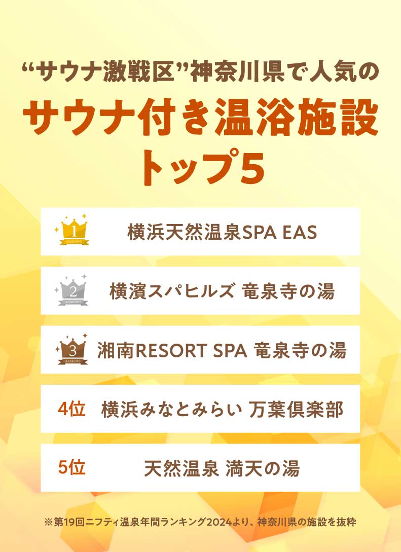 日々時間に追われるビジネスマンにとって、「ととのう」は至極の癒し。近年では雑居ビルの一角にサウナだけを楽しめる「サウナ専用施設」なども登場し、日本の“サウナ熱”は高まるばかりです。そこで今回は、ニフティ温泉年間ランキング2024をもとに、特に「サウナ熱」が高い神奈川県の人気温泉施設TOP5を紹介します。