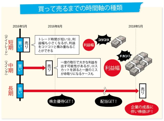 買ってから売るまでの時間は、大きく「長期」と「短期」に分けることが一般的です。長期は1年以上、短期はデイトレード(1日)やスイング(1週間から1カ月程度)があります。スイングは、その間をとって「中期」とする人もいます。