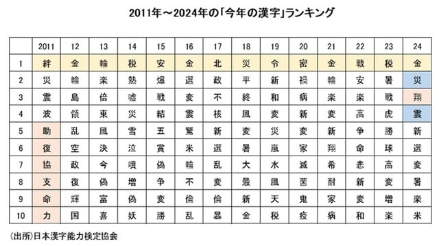 2024年の「今年の漢字」は「金」になった。「金」は、2000年・2012年・2016年・2021年に続き、五度目の選出になる(図表1)。