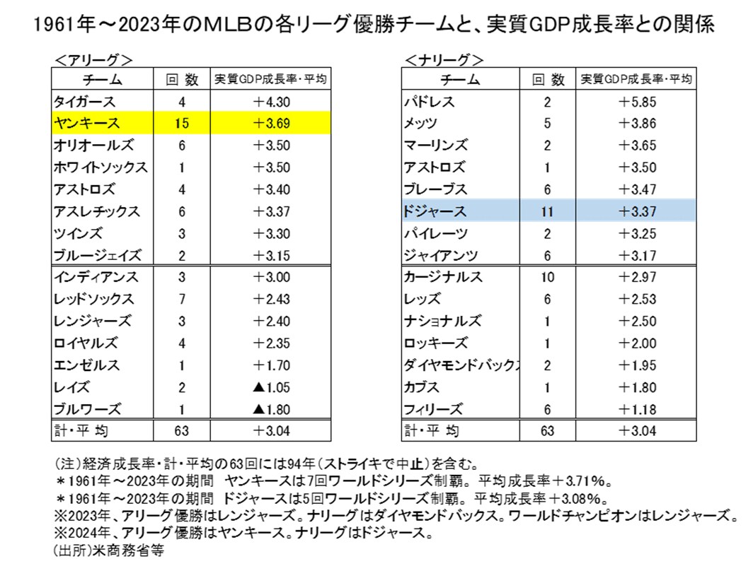 まず、1961年から2023年までの63年間(ストライキで中止された1994年を含む)における実質GDP成長率の平均は+3.04%である。ヤンキースのリーグ優勝回数は15回で、実質GDP成長率の平均は+3.69%。ドジャースのリーグ優勝回数は11回で、実質GDP成長率の平均は+3.37%。すなわち、大都市を本拠地にする人気チームがリーグ優勝した年は、どちらも63年間の成長率平均を上回るという結果になった(図表)。