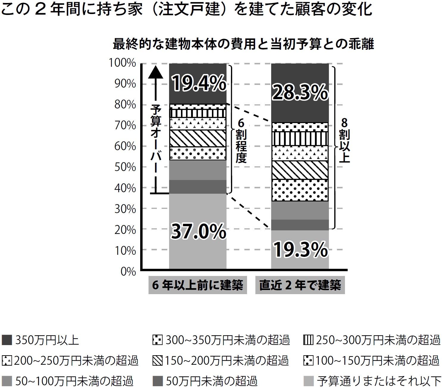 実際この2年で注文住宅を建てることができた顧客のなかでも、当初の予算をオーバーしたり、方針を変更したりという人が増えています。
