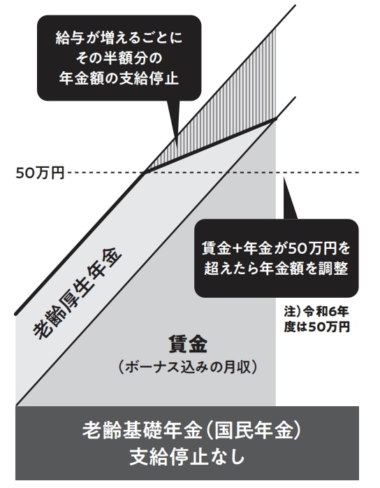 具体的には、「基本月額(老齢厚生年金のうち、報酬に応じて計算される部分の月額)」に「総報酬月額相当額(標準報酬月額+年間の賞与額÷12)」を加えた金額が50万円(令和6年度=2024年度)を超えている場合、その超えた金額の2分の1が、厚生年金から差し引かれる、というものです。