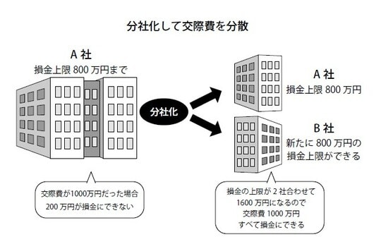 また、分社化すると800万円の枠がもう1つできるけど、800万円という上限が消えるわけじゃない。そのため、会社を1つから2つにしても、交際費が2000万円かかった場合は400万円が損金不算入になる(2000万円−800万円×2社)。