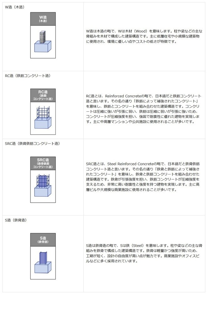 W造以外にも、RC造やSRC造、S造といった建築構造があります。