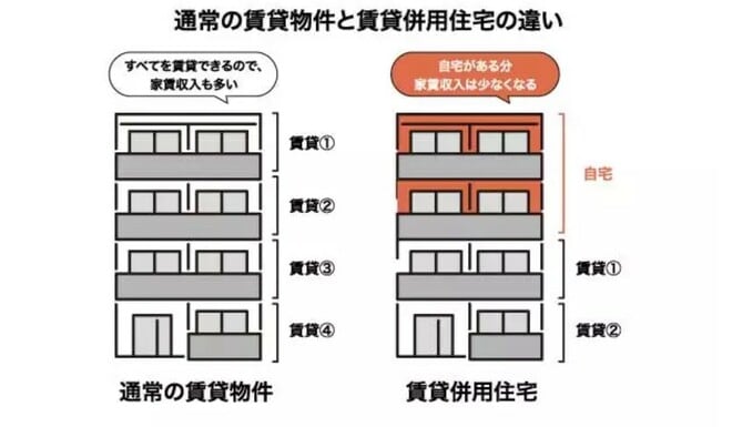 賃貸併用住宅は、自宅部分の面積分だけ家賃収入を得られないため、通常の賃貸物件と比較して利回りが低くなります。
