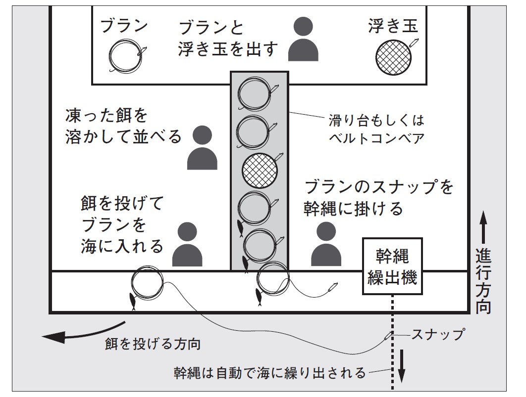 まず投縄の仕事として、餌投げ(餌掛けとも言う)、スナップ掛け、ブラン出し、餌出し。
