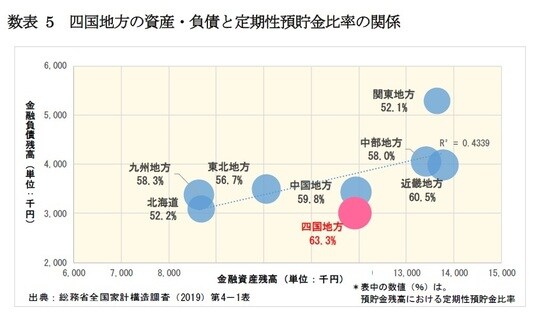 また、四国地方は、南海トラフ地震や急峻な地形、台風常襲地域など風水害の発生リスクが高い地域特性もあり、長期的視野での資産運用が意識される傾向があるとされる。家計の資産・負債を見ても資産残高は中位(全国8エリアで5位)ながら、負債を極力抑え(全国8エリアの中で最小)、定期性預貯金に重点を置く堅実な資産形成が特徴的である。