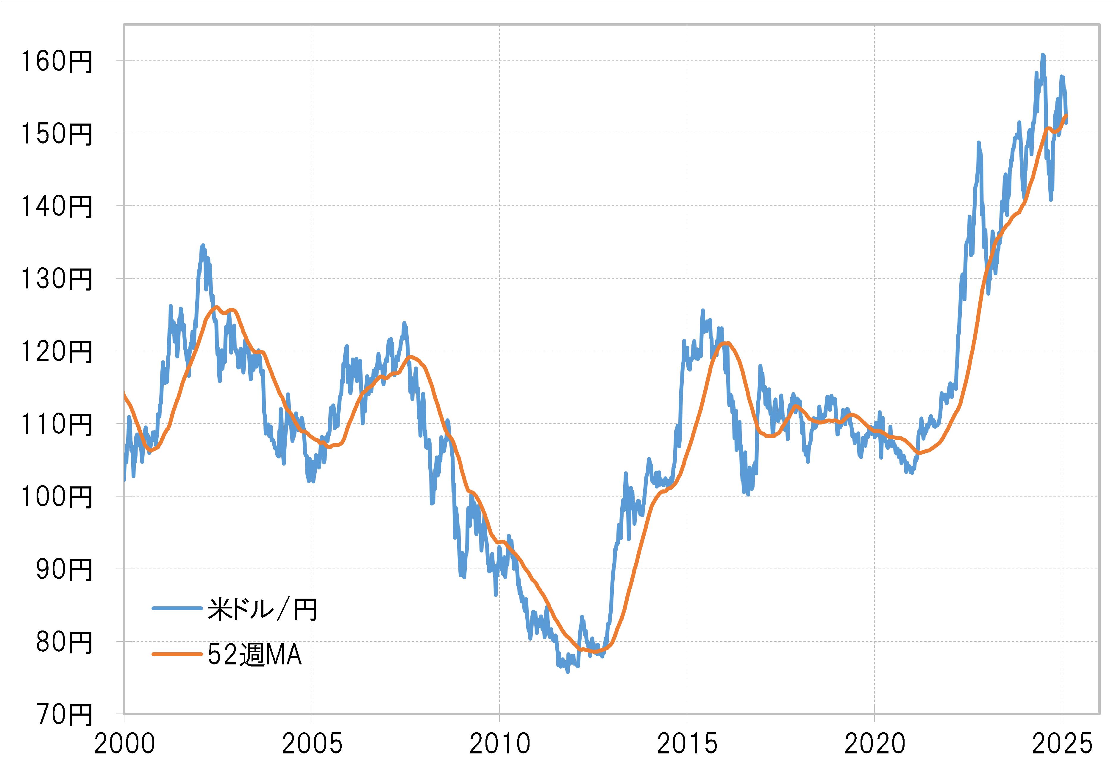 米ドル/円は2024年夏に一時139円まで下落が拡大するなかで52週MAを大きく下回り、経験的には下落(米ドル安・円高)トレンドへ転換した可能性が浮上しました。