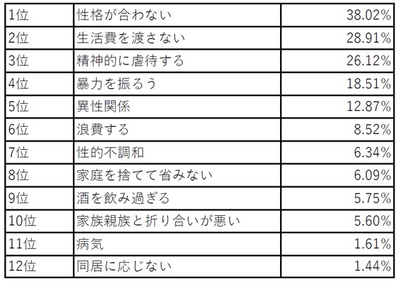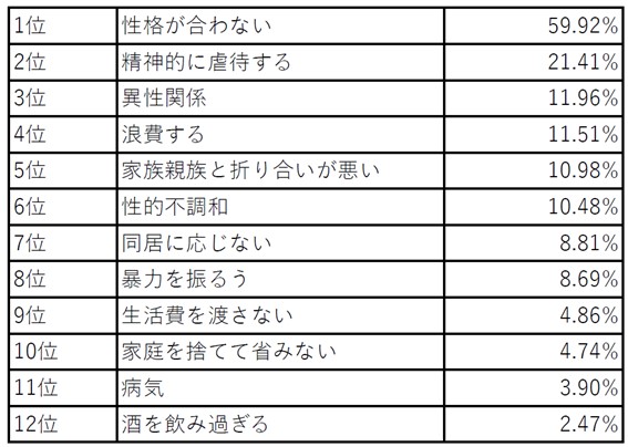 気になる離婚の理由と順位は、夫と妻では下記のように異なっています。