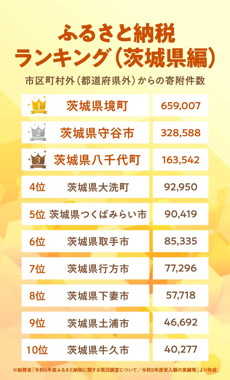日本の地方自治体を支援するための寄付制度である「ふるさと納税」。楽しみなのはやっぱり返礼品。寄付先の自治体から地域の特産品や名産品の数々をゲットできて、しかも地域貢献までできると一石二鳥。今回は総務省がまとめた「2023年度の市区町村外からの寄付件数」に基づいて「茨城県」のふるさと納税ランキングを発表。寄付件数の多い順にベスト10を発表します。