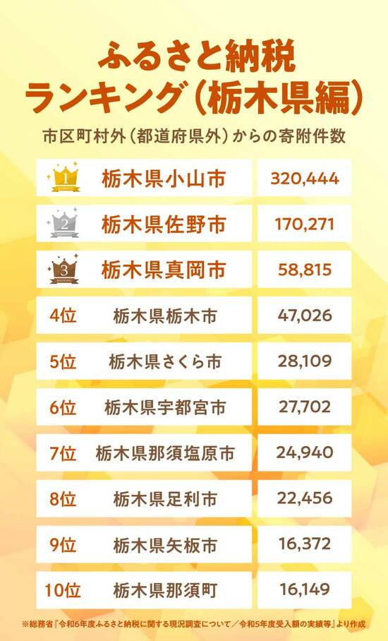 日本の地方自治体を支援するための寄付制度である「ふるさと納税」。楽しみなのはやっぱり返礼品。寄付先の自治体から地域の特産品や名産品の数々をゲットできて、しかも地域貢献までできると一石二鳥。今回は総務省がまとめた「2023年度の市区町村外からの寄付件数」に基づいて「栃木県」のふるさと納税ランキングを発表。寄付件数の多い順にベスト10を発表します。