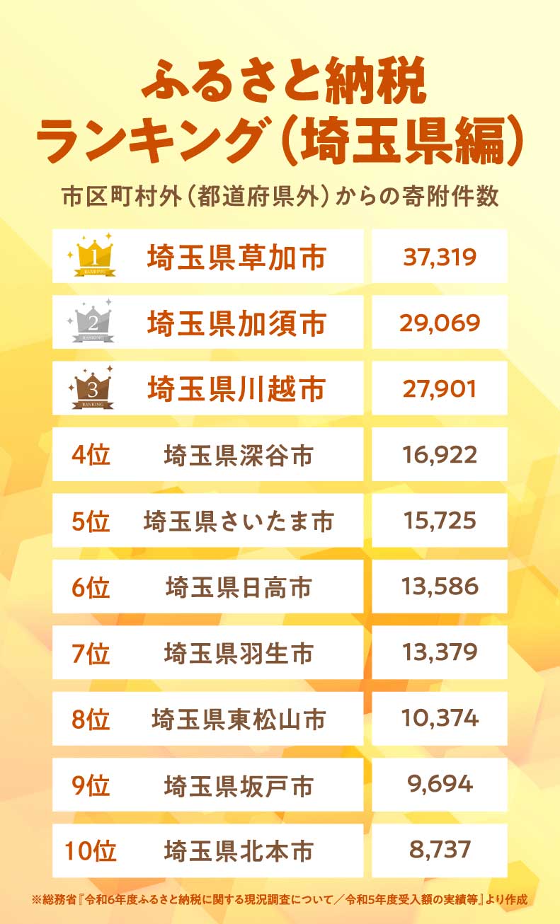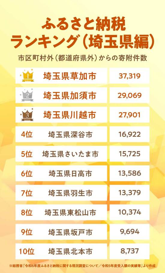 日本の地方自治体を支援するための寄付制度である「ふるさと納税」。楽しみなのはやっぱり返礼品。寄付先の自治体から地域の特産品や名産品の数々をゲットできて、しかも地域貢献までできると一石二鳥。今回は総務省がまとめた「2023年度の市区町村外からの寄付件数」に基づいて「埼玉県」のふるさと納税ランキングを発表。寄付件数の多い順にベスト10を発表します。