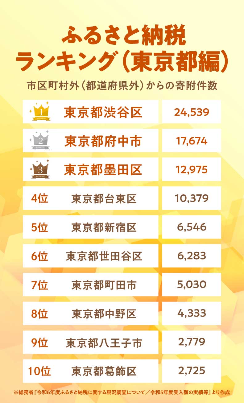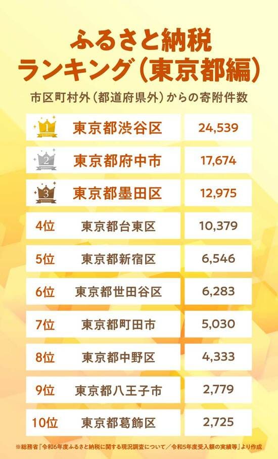 日本の地方自治体を支援するための寄付制度である「ふるさと納税」。楽しみなのはやっぱり返礼品。寄付先の自治体から地域の特産品や名産品の数々をゲットできて、しかも地域貢献までできると一石二鳥。今回は総務省がまとめた「2023年度の市区町村外からの寄付件数」に基づいて「東京都」のふるさと納税ランキングを発表。寄付件数の多い順にベスト10を発表します。