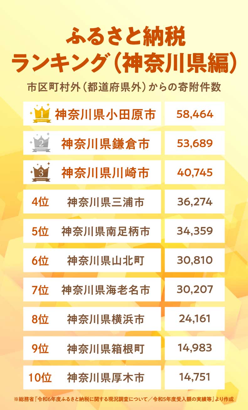 日本の地方自治体を支援するための寄付制度である「ふるさと納税」。楽しみなのはやっぱり返礼品。寄付先の自治体から地域の特産品や名産品の数々をゲットできて、しかも地域貢献までできると一石二鳥。今回は総務省がまとめた「2023年度の市区町村外からの寄付件数」に基づいて「神奈川県」のふるさと納税ランキングを発表。寄付件数の多い順にベスト10を発表します。