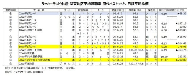 また、18年ワールドカップでコロンビアに2対1で勝った試合のテレビ視聴率(ビデオリサーチ調べ、関東地区)は48.7%と歴代10位に相当し、翌日の日経平均株価は276円95銭高と3ケタ上昇になった(図表1)。
