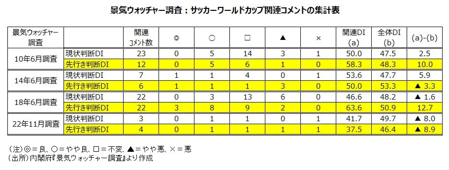 12月『景気ウォッチャー調査』では調査期間がワールドカップ決勝から間が空いたため、ワールドカップについてコメントした人は、現状判断・先行き判断ともにゼロだった(図表3)。