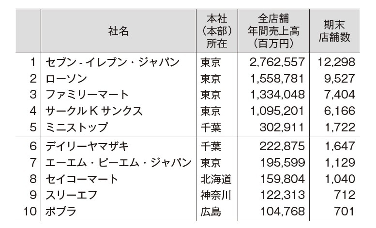 (注)エリア・フランチャイズを含む。ただし、ミニストップのみエリア・フランチャイズの数字を得られず合算していない。