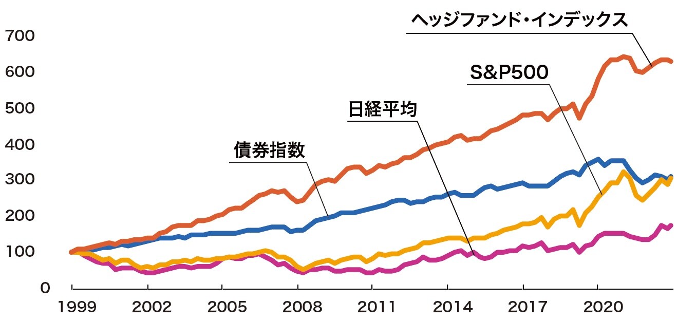 ご覧のとおり、伝統的な投資手法である株式や債券とは距離を置き、他指数を大きくアウトパフォーム(日経平均株価等のベンチマークに対して、ある指数もしくは銘柄における一定期間の収益率が上回っている、または上回りそうなこと)しています。ヘッジファンドは市場が上がっても下がっても利益を追求するものであり、これを「絶対収益追求型」といいます。