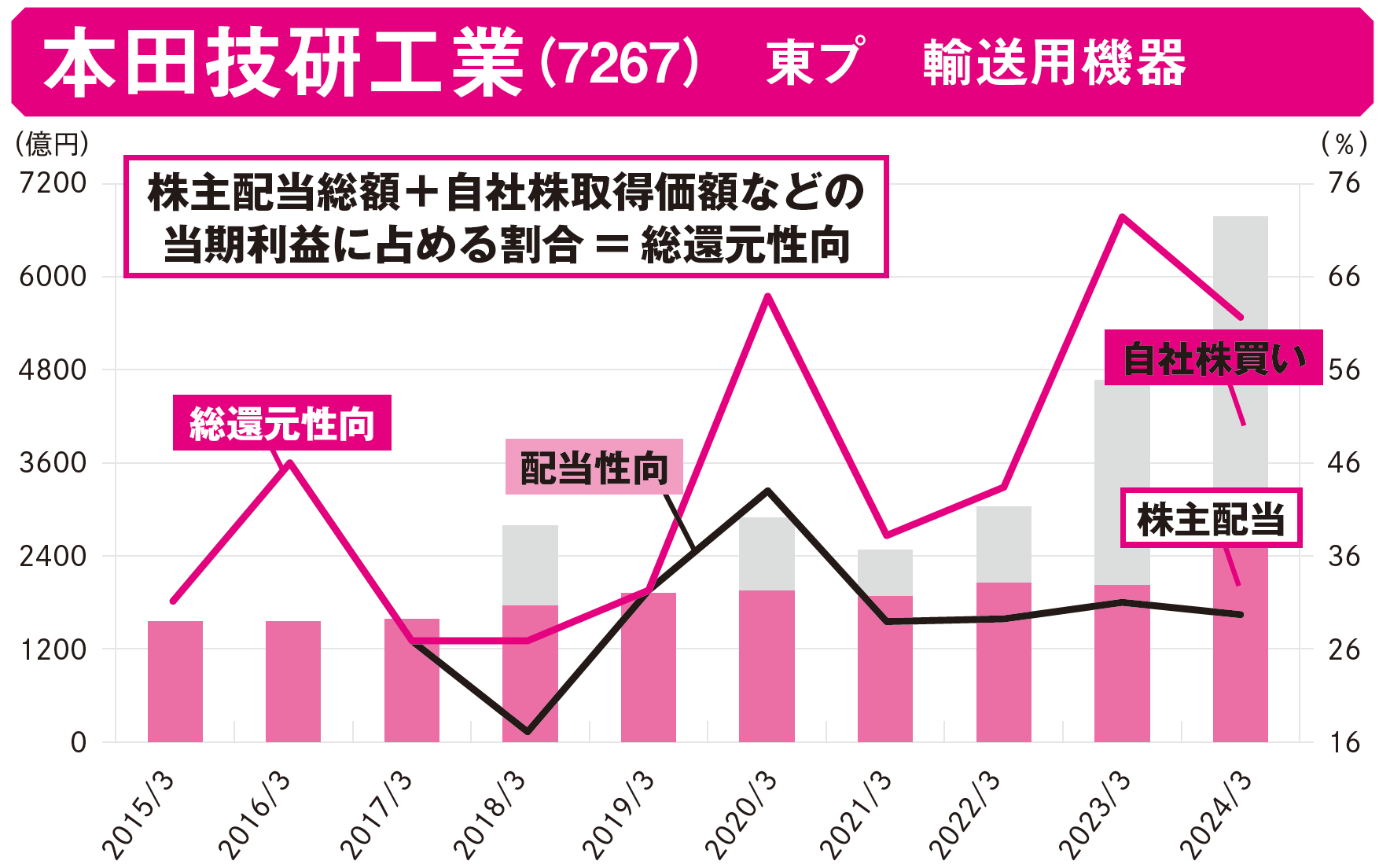 株主還元には株主配当だけでなく、自社株買いという方法もあります。[図表2]に示したように、近年の本田技研工業は自社株買いにも力を入れており、株主配当と自社株買いによる総還元性向が右肩上がりで推移。2023年3月期以降は60%を超えていることがわかります。