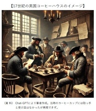 東アフリカを原産地とするコーヒーはイスラム世界から欧州に入ってきた。英国のロンドンに初めてコーヒーハウスが建てられたのは1652年であり、この点に異説はないようだ。ピューリタン革命で国王が斬首されてから3年後、共和制の時代である。17世紀の英国はこの後、王政復古から名誉革命に向かっていく。