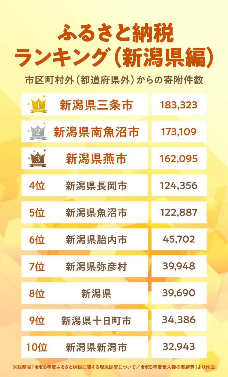 日本の地方自治体を支援するための寄付制度である「ふるさと納税」。楽しみなのはやっぱり返礼品。寄付先の自治体から地域の特産品や名産品の数々をゲットできて、しかも地域貢献までできると一石二鳥。今回は総務省がまとめた「2023年度の市区町村外からの寄付件数」に基づいて「新潟県」のふるさと納税ランキングを発表。寄付件数の多い順にベスト10を発表します。