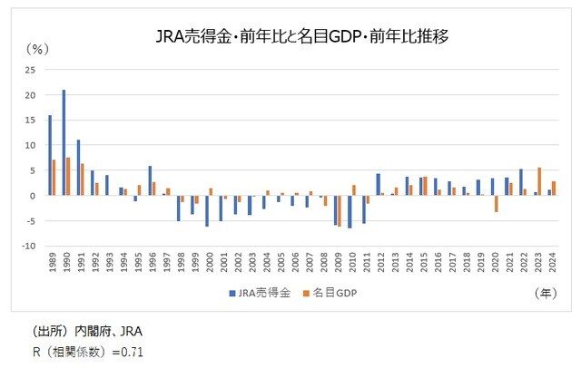 「JRA(日本中央競馬会)売得金・前年比」と、平成元年から令和6年(1989年~2024年)までの「名目GDP・前年比」の相関係数は0.71と高い数字になっている。