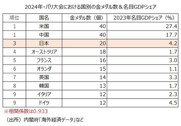 この傾向は、2024年・パリ大会でも続いた。日本は金メダルを20個獲得し、ランキングは第3位。ランキング10位までの国の金メダル数と、2023年(=当時最新)の世界経済に占める名目GDPシェアの相関係数は0.933と、数字が高まった(図表4)。