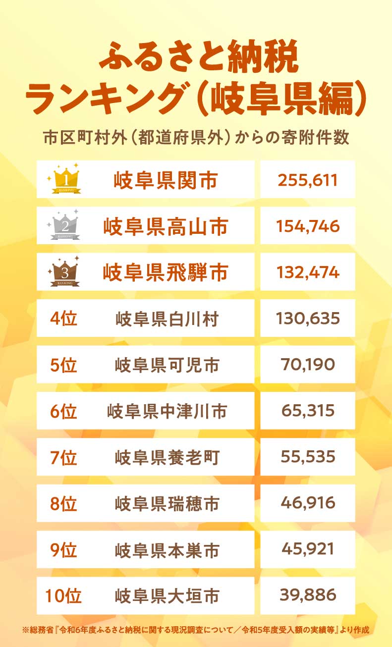 日本の地方自治体を支援するための寄付制度である「ふるさと納税」。楽しみなのはやっぱり返礼品。寄付先の自治体から地域の特産品や名産品の数々をゲットできて、しかも地域貢献までできると一石二鳥。今回は総務省がまとめた「2023年度の市区町村外からの寄付件数」に基づいて「岐阜県」のふるさと納税ランキングを発表。寄付件数の多い順にベスト10を発表します。