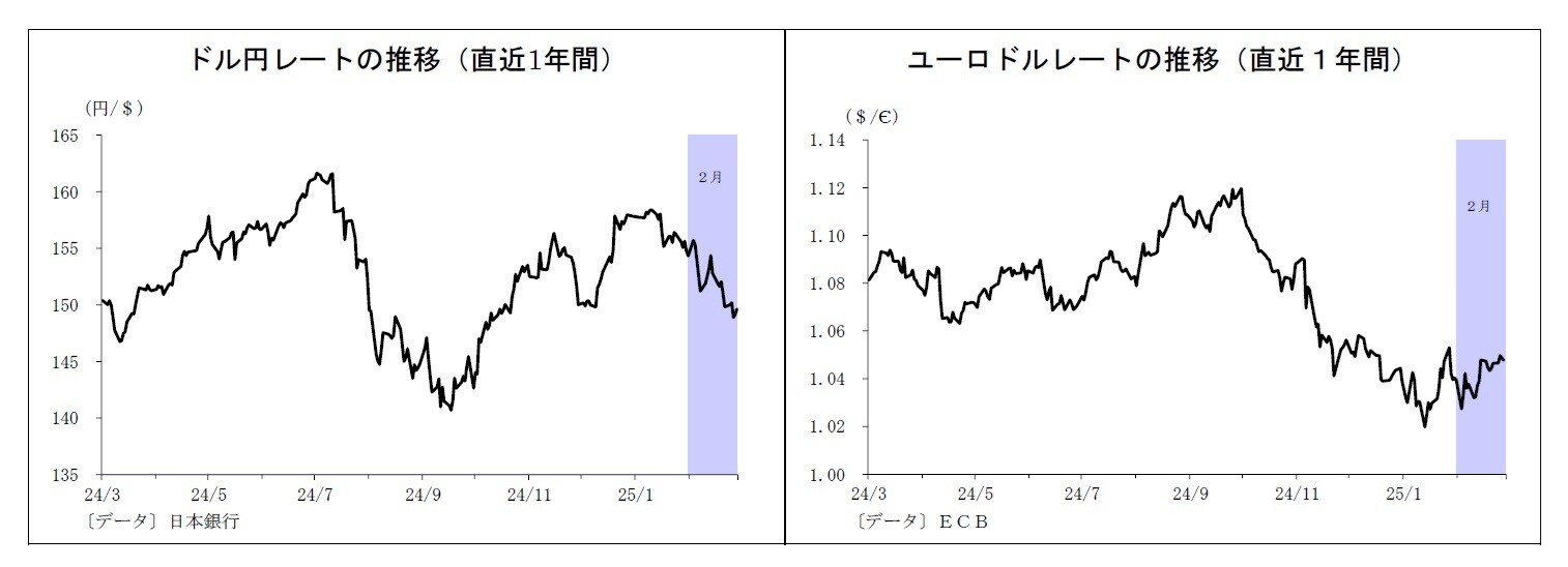 月初、米政権によるカナダ・メキシコ関税の発動延期に伴うリスク選好のユーロ買いや米経済指標の悪化を受けて上昇し、5日に1.04ドル台前半に。その後は持ち高調整が入り、しばらく1.03ドル台での一進一退が継続したが、米政権の活発な動きによってロシア・ウクライナの停戦期待が高まったことで地理的に近いユーロが買われ、14日には1.04ドル台後半に上昇した。