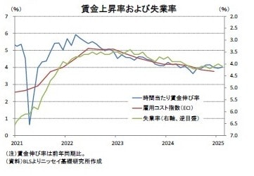 今後も労働需給の緩和から賃金上昇圧力の低下傾向が続くとみられる。ただし、トランプ政権が大規模な不法移民の強制送還を実施する場合には建設業や農業、接客業で労働力不足が顕在化し、賃金上昇圧力が再び高まる可能性があろう。