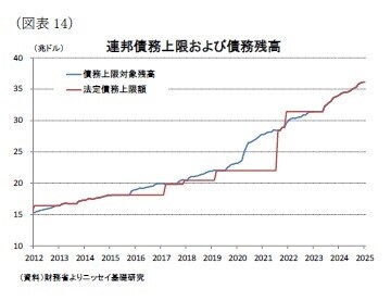 一方、25年1月2日にこれまで不適用となったいた連邦債務上限が36.1兆ドルで復活し、財務省は債務上限の抵触をさけるための特別措置で凌いでいる。この問題に関連して、下院の予算決議では債務上限を4兆ドル引き上げることも盛り込まれた。