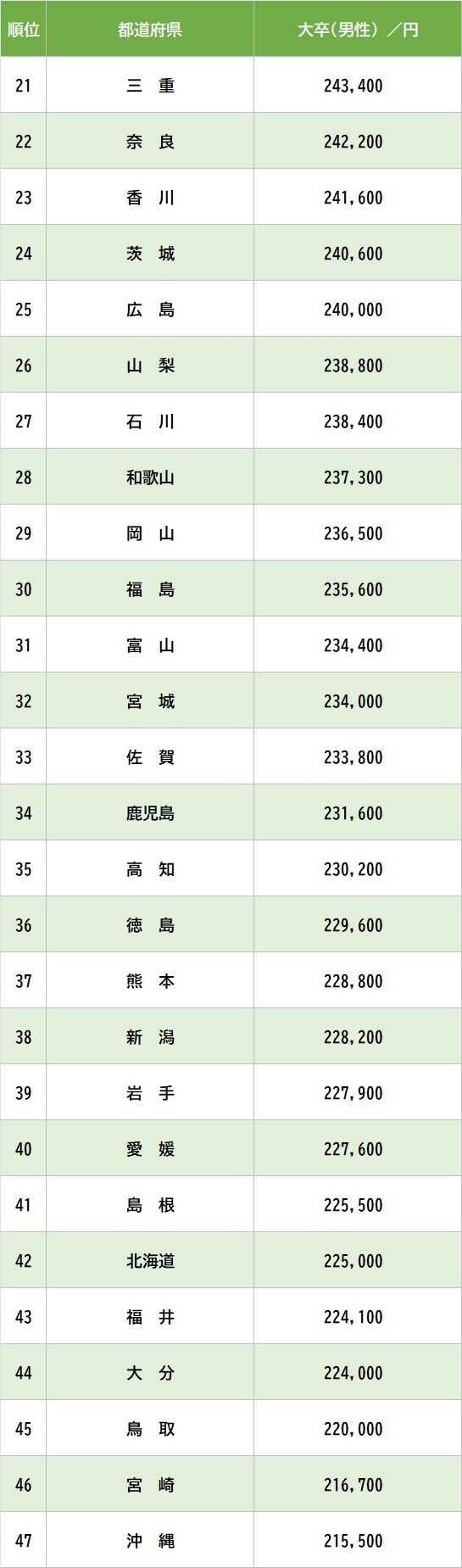 47都道府県「大卒新入社員(男性)の平均給与」…21~47位