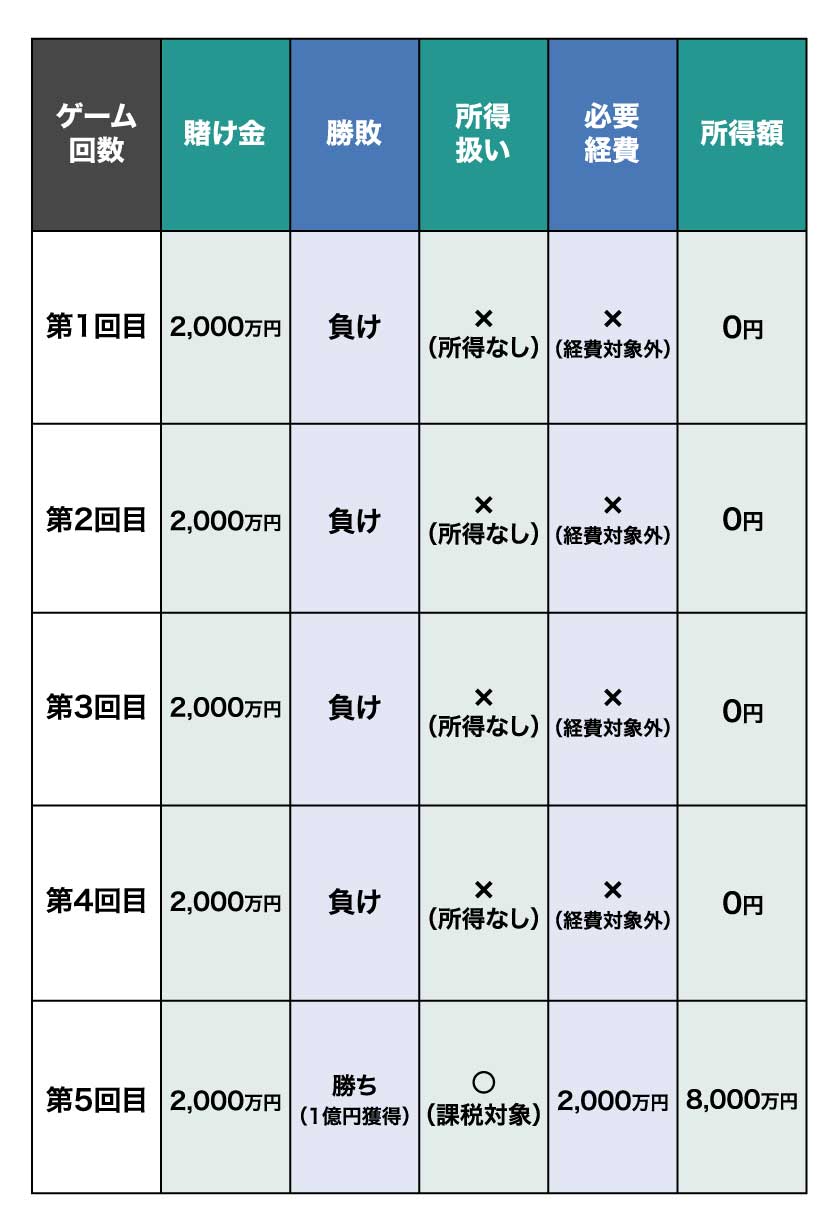 1ゲームごとに所得計算をするということは、負けたゲームの損失分(前述の例では2,000万円×4回分=8,000万円)が、勝ったゲームの経費にならないということなのです。