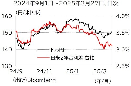 為替市場では、トランプ政権の関税政策を巡り、多くの国に減免措置が講じられる可能性が高まったことで米景気の先行きへの懸念が和らいだことや、3月の米サービス業PMIが米景気の底堅さを示したことなどを受け、米金利の上昇とともに1米ドル=151円手前まで円安米ドル高が進行した後、3月のコンファレンスボード消費者信頼感指数が市場予想を下回ると、円高米ドル安に転じるなどおおむね149円~151円のレンジで推移しました。28日には1米ドル=151.11円と21日(149.06円)に比べ、円安米ドル高となりました(図表1)。