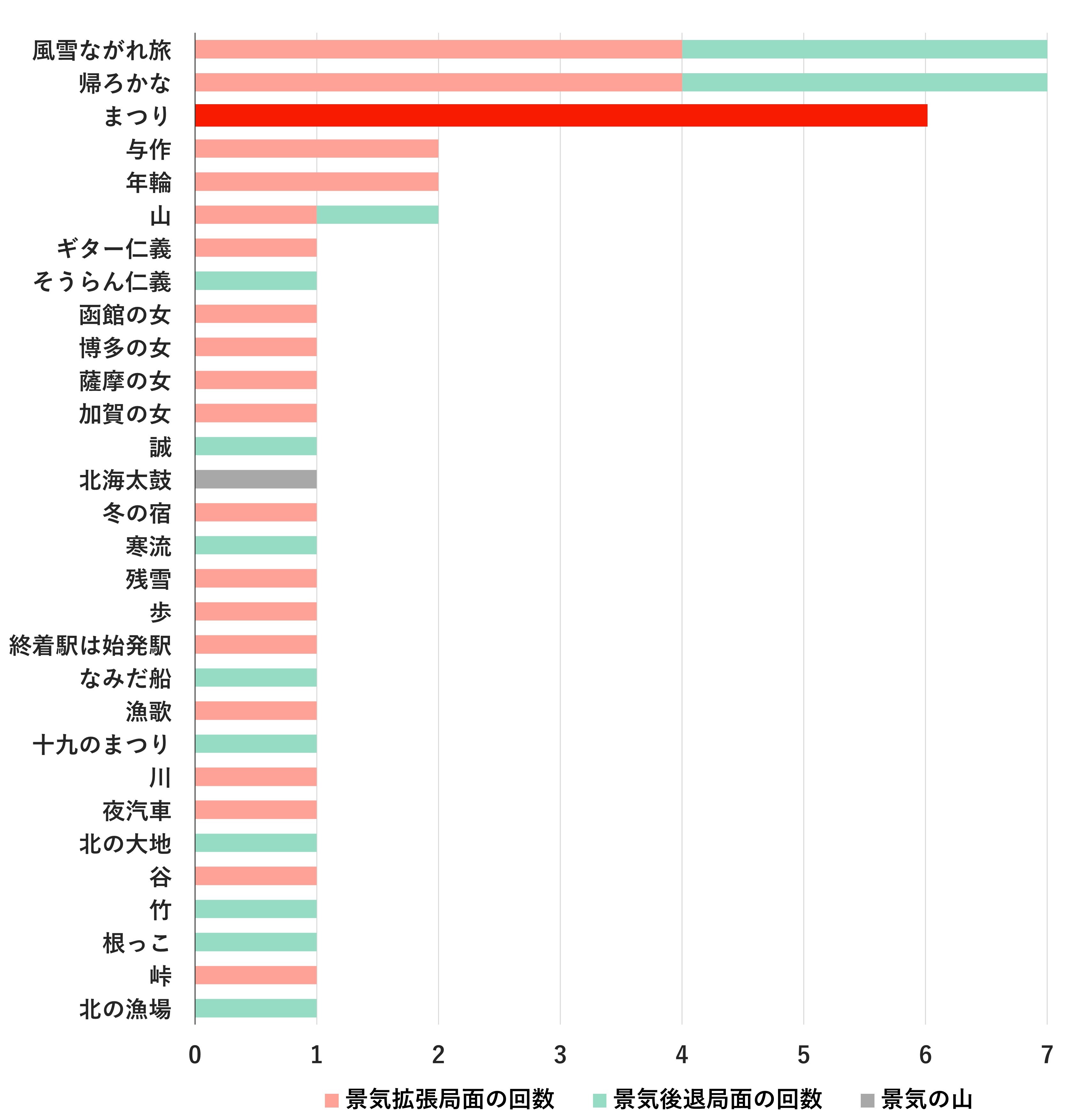 それぞれの曲を歌った年の12月の景気局面をみると、「風雪ながれ旅」と「帰ろかな」はそれぞれ景気拡張局面4回、景気後退局面3回とほぼ半々であるのに対し、「まつり」は6回ともすべて景気拡張局面にあたる。