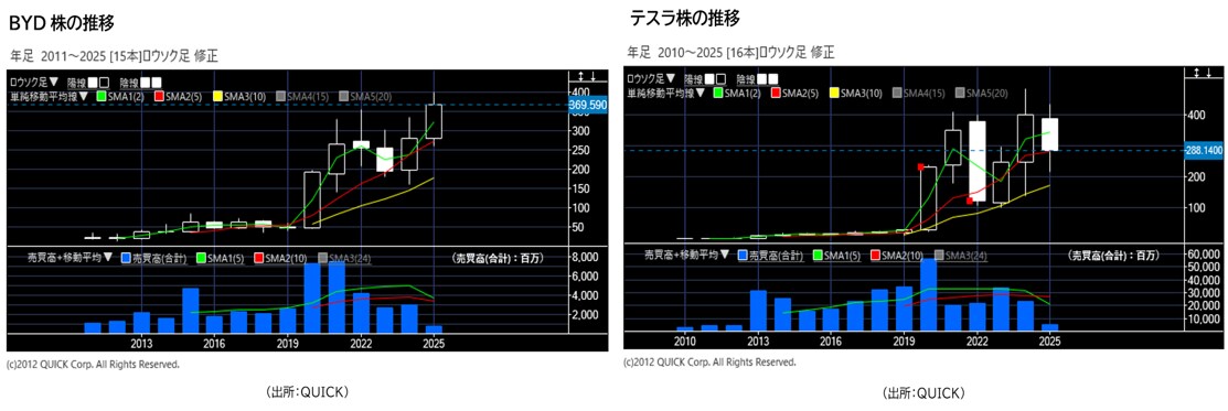 また、EVを巡る米中の戦いも続いている。2024年に中国EVメーカーBYDのバッテリーEV年間販売台数は176万台に達し、米テスラの179万台に肉薄している。同年の売上高はBYDが7,770億元(1,070億ドル)とテスラの977億ドルを上回った。