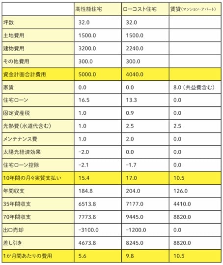 最終的に1か月間の支払い額で比較すると、耐震性や耐久性、断熱性などに優れた高性能住宅が最も低くなります。ローコスト住宅は初期費用を抑えられたとしても、結果、賃貸とほとんど同じ支払い額になります。また、引っ越しをすることになった場合は、図表1の出口売却の部分を見ていただければわかると思いますが、高性能ならば家に価値があるため貸したり売ったりすることが可能です。自分が望む利便性、快適性、デザイン性といった暮らしの豊かさは、注文住宅による高性能住宅が最も得られやすいといえるでしょう。