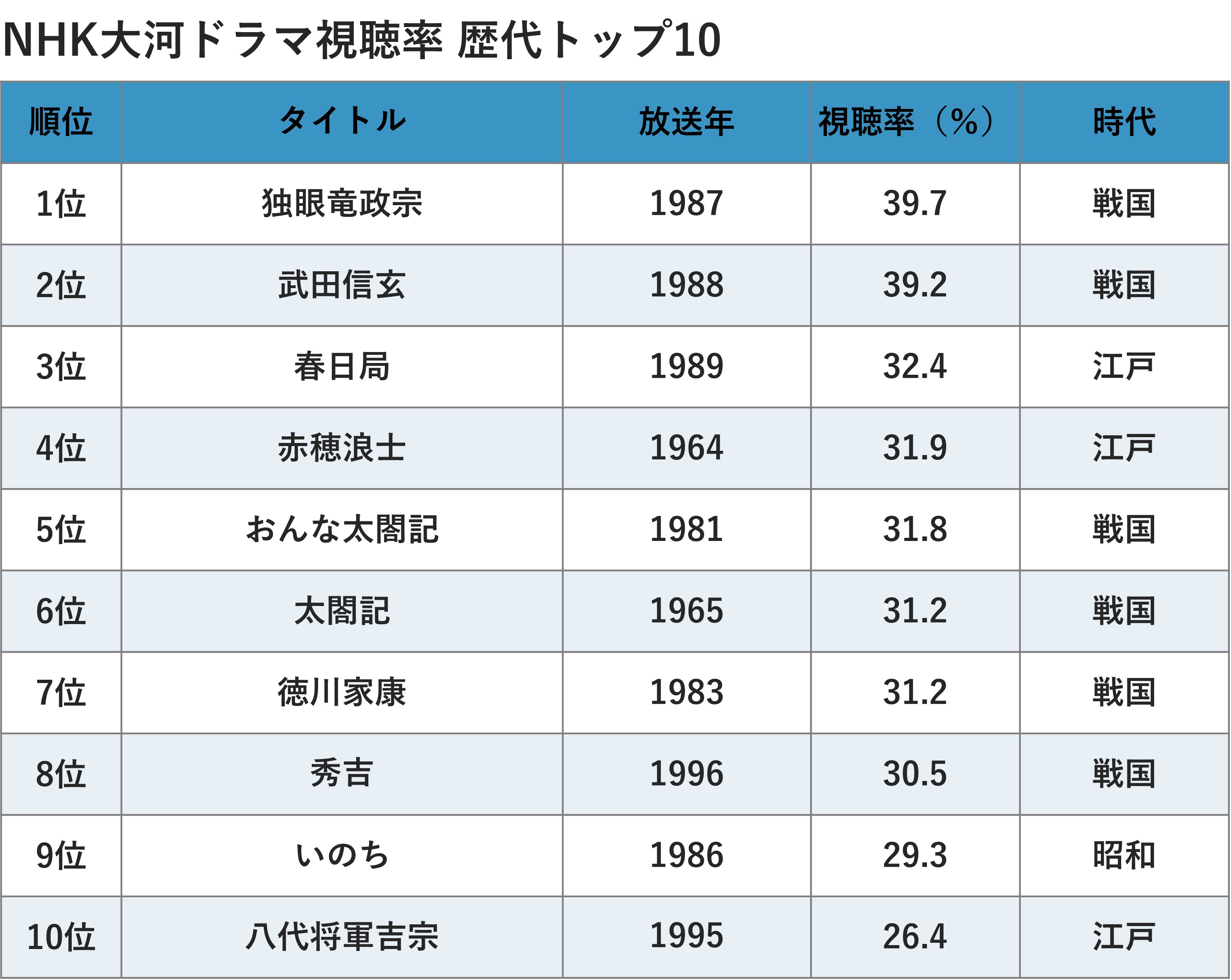 テレビ視聴率を重視するなら「戦国」の世を選んだほうがいいようだ。戦国時代の出世物語の視聴率は他の時代と比べて高い。歴代高視聴率ランキングベスト10のうち戦国物が6本も入っていて、3本の「江戸」を引き離している。歴代で一番高い視聴率は、「独眼竜政宗」(1987年、年間平均視聴率39.7%)、次いで「武田信玄」(1988年、年間平均視聴率39.2%)でいずれも「戦国」だ。