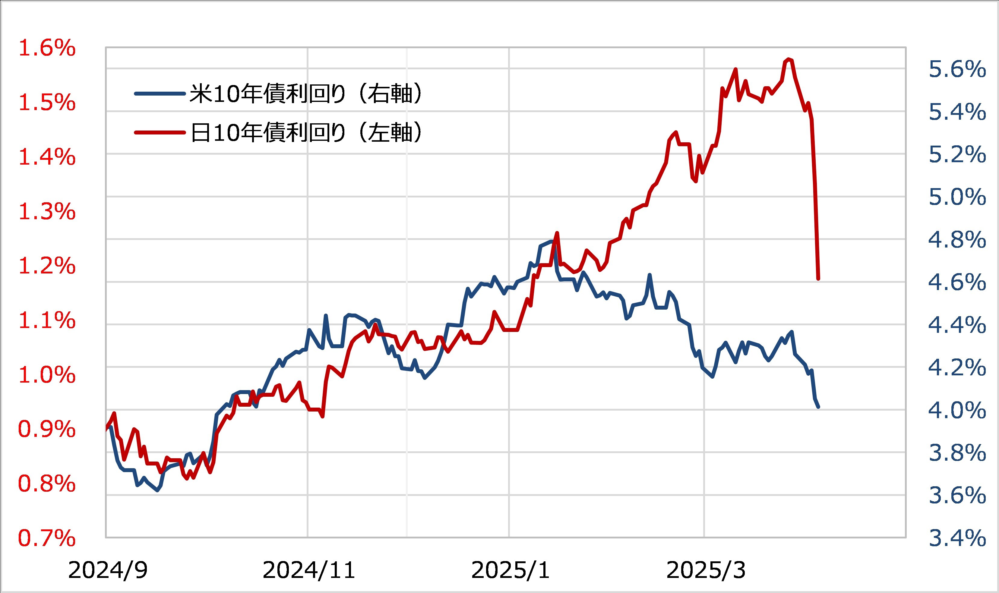 今回のトランプ大統領の相互関税は予想以上に厳しい内容で、このため世界的な貿易戦争により米国を含めた世界経済を大きく悪化させる懸念があるとして、世界的な株価が急落、米金利も大きく低下したとされます。ただし、実は日米の金利差(米ドル優位・円劣位)の縮小は、一方で日本の金利も大きく低下したことにより限られるところとなりました(図表2参照)。では、日米の金利差の縮小が限られたなかで、米ドル/円が一日で5円以上もの急落となったのはなぜなのでしょうか。