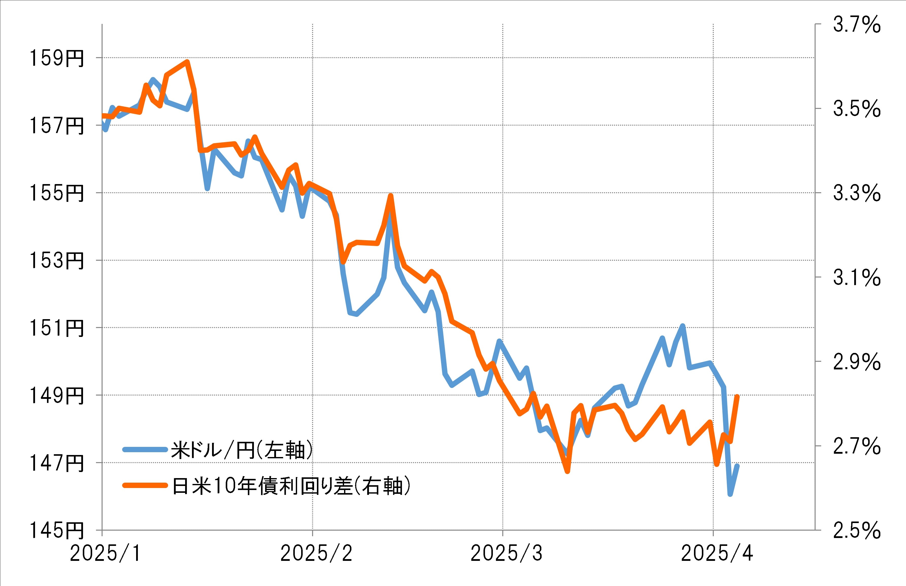 相互関税発表以前に、米ドル/円は一時151円まで反発しましたが、これは日米の金利差から見ると「上がり過ぎ」でした。その意味では、相互関税の発表をきっかけとした米ドル/円の急落「関税ショック」は、金利差からのかい離の修正ということが基本だったのではないでしょうか。